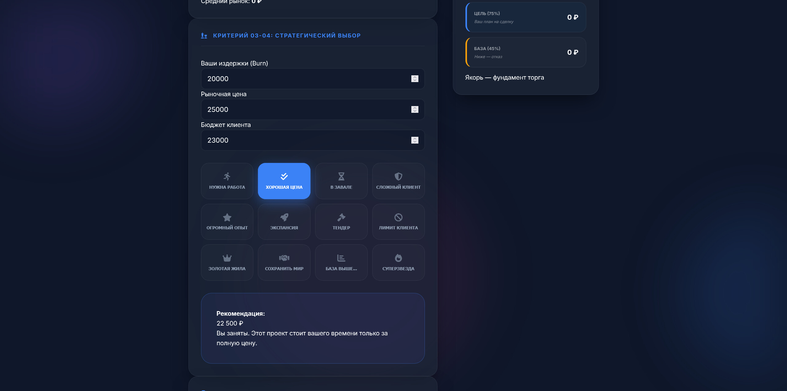 - Штурвал переговоров — моя любимая часть. Система «якорных цен» и 12 сценариев торга. Вы выбираете свою ситуацию (от «нужна работа» до «я суперзвезда»), и система рассчитывает идеальную цену для защиты вашей позиции.