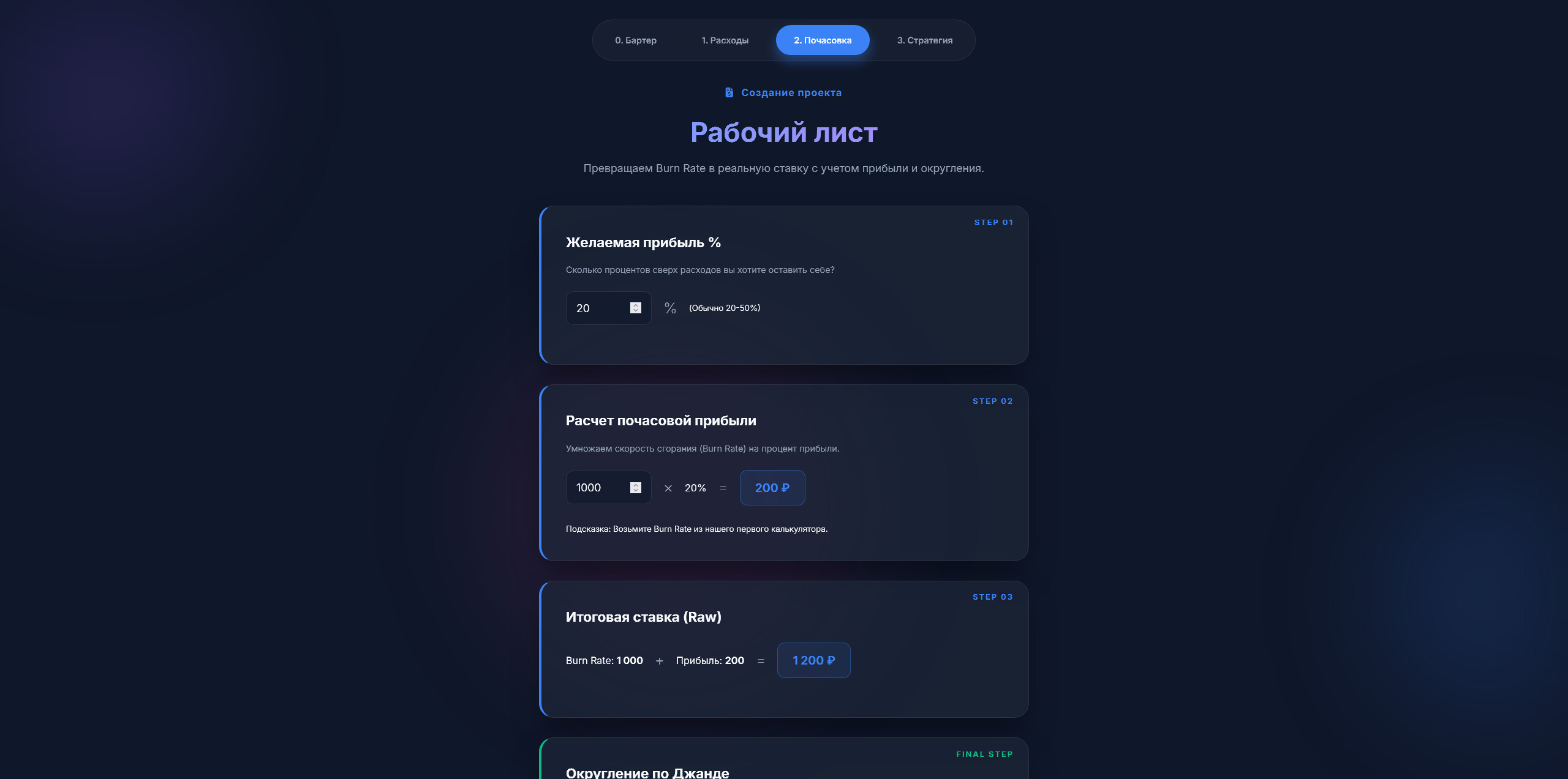 - Оценщик проектов (Сметы) — превращаем ставку в профессиональную смету. Здесь встроен алгоритм «умного округления», чтобы ваши цены выглядели солидно, а не как ценники на распродаже.