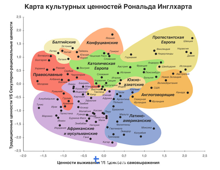 Традиционные vs. Секулярно-рациональные ценности (вертикаль): Секулярно-рациональные ценности предполагают, что религия — это частное дело человека, а не государства. Экономический эффект здесь в том, что человек не требует от государства поддержки и монополии, что способствует конкурентным экономикам.