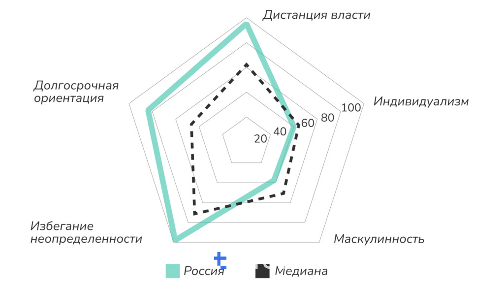 Согласно закону Хофстеде, Россия — феминная нация . Это означает, что у нас низкая готовность следовать стандартам и выполнять долгосрочные планы . Это объясняет, почему, например, в XX веке СССР смог создать атомную бомбу, спутник и космический корабль, но не смог сделать конкурентоспособный автомобиль или персональный компьютер.