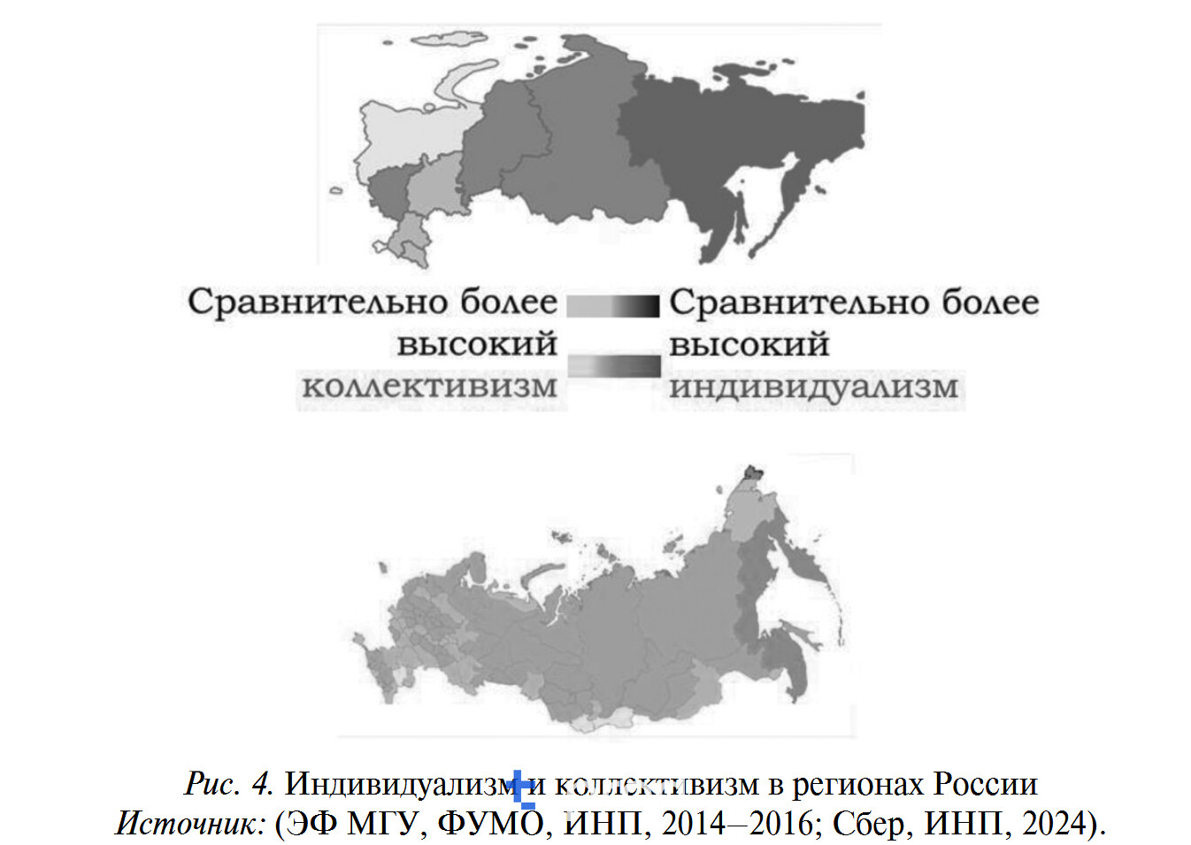 Индивидуалистическая И-Россия: Распространена в мегаполисах и от Урала на восток (максимально на Сахалине). Это «индивидуализм беглецов» — людей, которые «действуют, не спрашивая разрешения» . И-Россия предъявляет спрос на радикальные инновации, конкуренцию и демократию . Русские эмигранты за рубежом — «радикальные индивидуалисты» , которые «не соединяются между собой».